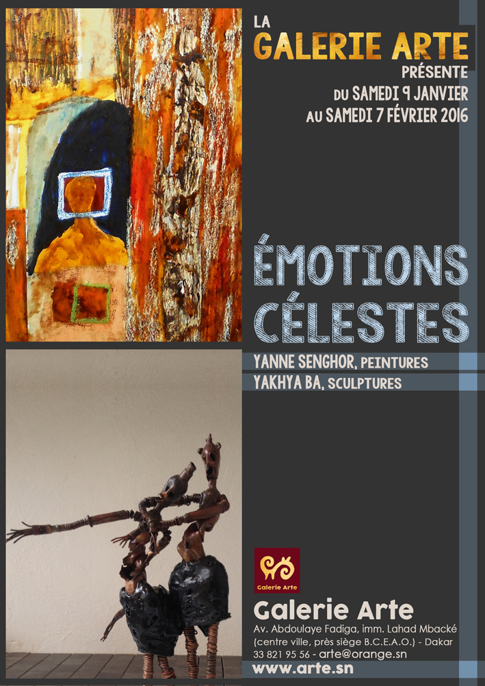Yanne Senghor peint des tableaux abstraits et Yakhya Ba crée des statues imaginaires. Les deux artistes ont une technique de création intuitive et leur univers est le monde invisible, le Cosmos. Yanne s’inspire souvent de la spiritualité comme garant d’équilibre de la société et Yakhya s’inspire des anges du Livre.